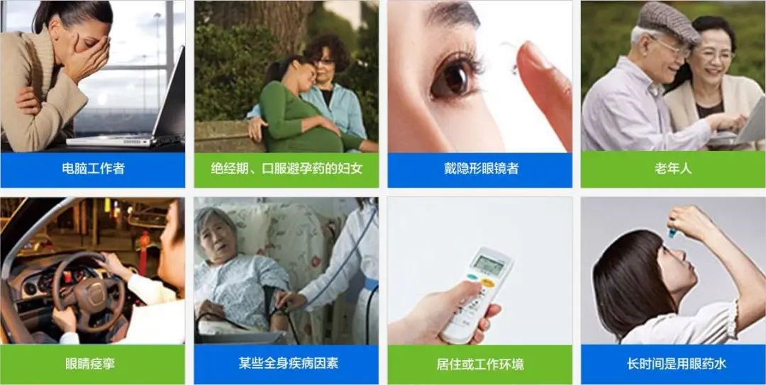 ③某些疾病患者:如类风湿性关节炎、糖尿病、甲状腺异常、哮喘、白内障、青光眼及红斑狼疮等。某些药物可使泪液分泌减少,导致干眼症状。